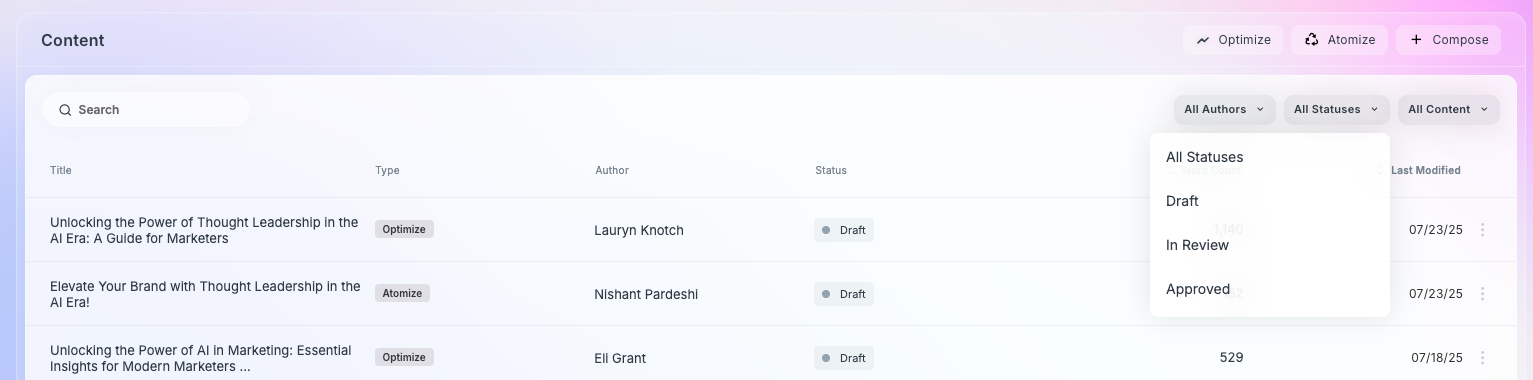 Filters in AIQ help you quickly narrow down your content list to what’s most relevant. Whether you're trying to review content by a specific teammate, check on in-progress drafts, or focus on a certain type of AIQ workflow (Optimize, Atomize, Compose), these filters make it easy to locate and manage your content effectively.