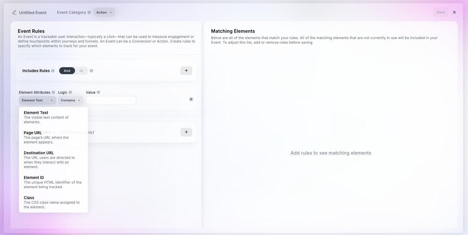 Within Event Builder, an Event is a trackable user interaction—typically a click—that can be used to measure engagement or define touchpoints within journeys and funnels. An Event can be a Conversion or Action. Create rules to specify which elements to track for your event.